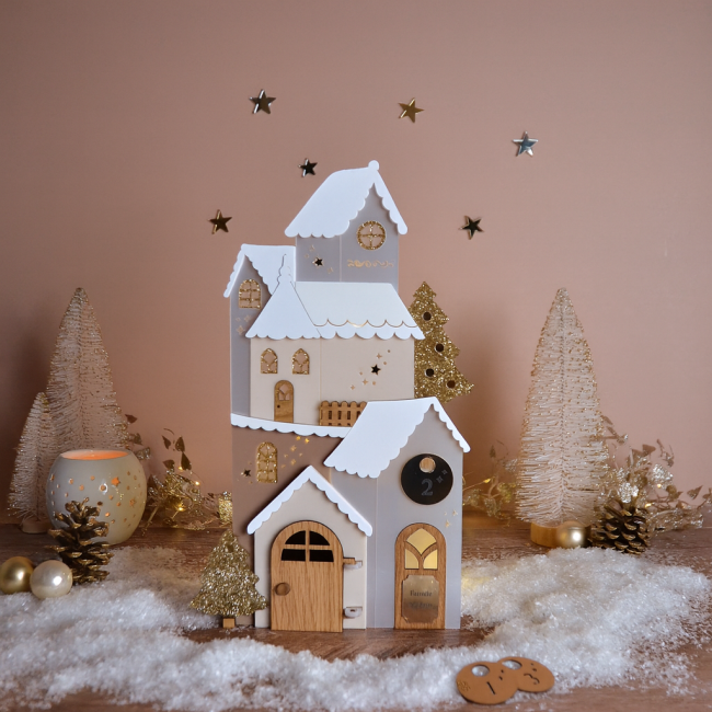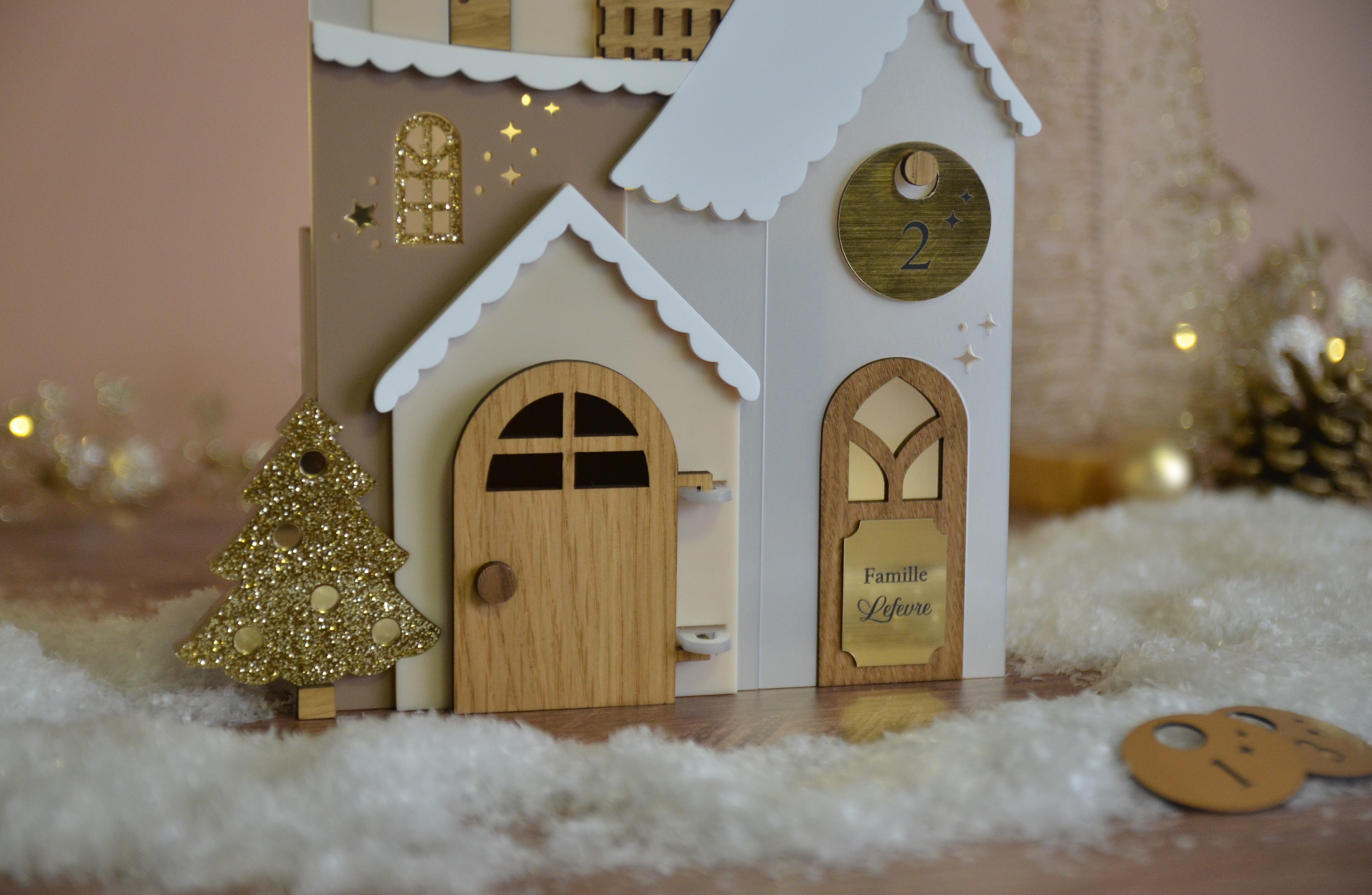 Calendrier de l’Avent en bois, thème village de Noël, livré assemblé