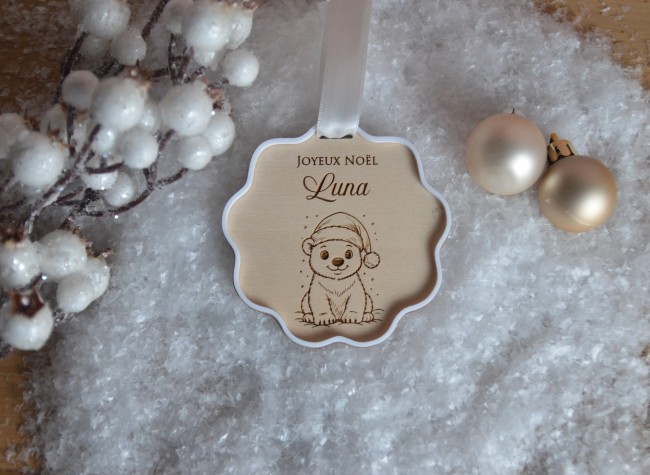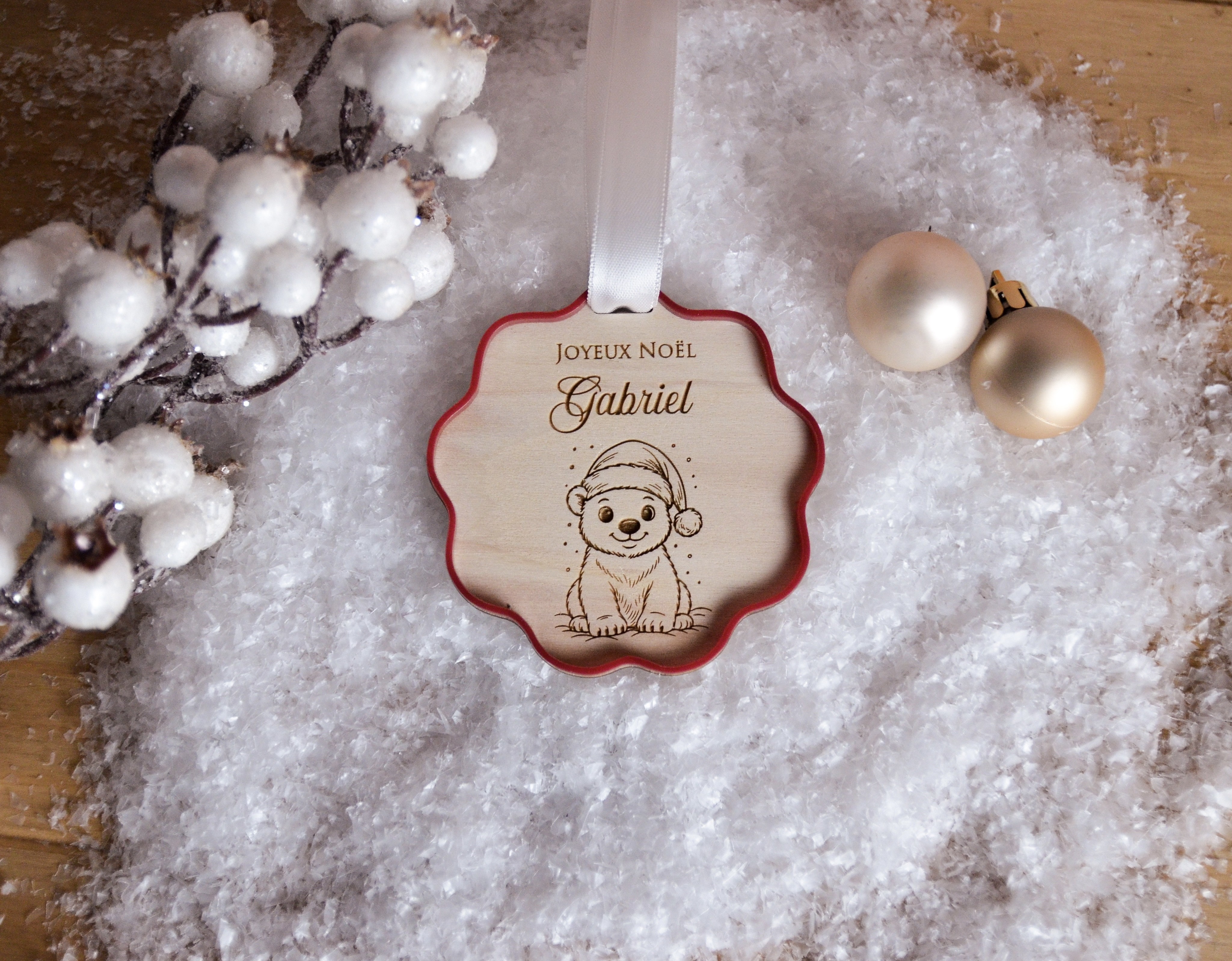 Laissez-vous charmer par cette boule de Noël personnalisée, délicatement gravée d’un adorable petite ourson au bonnet de Père Noël.