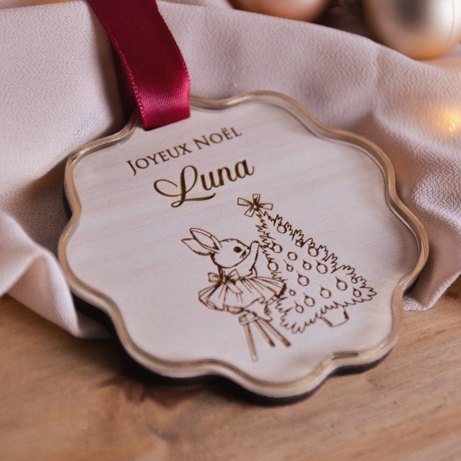 Sous la lumière du sapin, une petite lapine curieuse ajoute la dernière touche à son arbre, dans un instant plein de douceur.