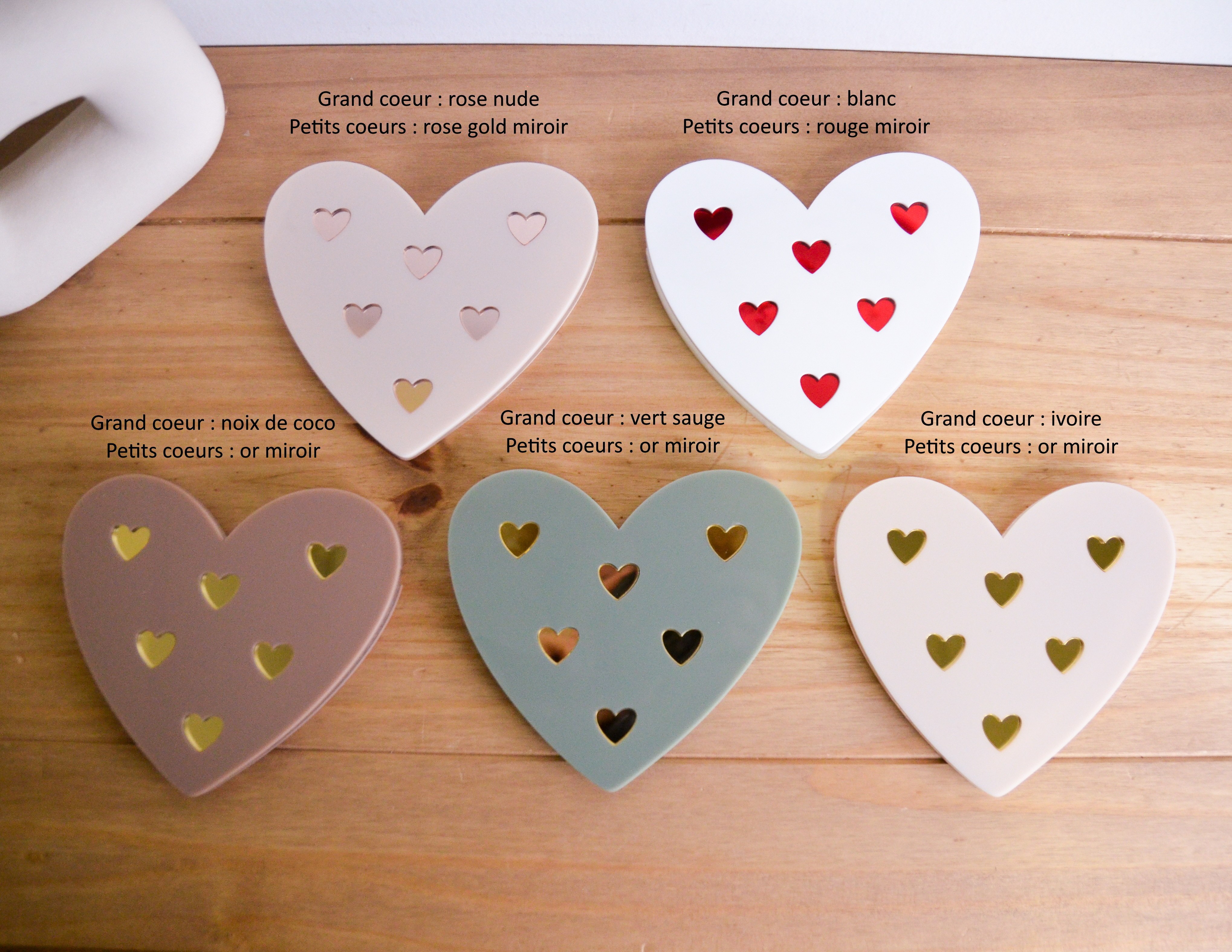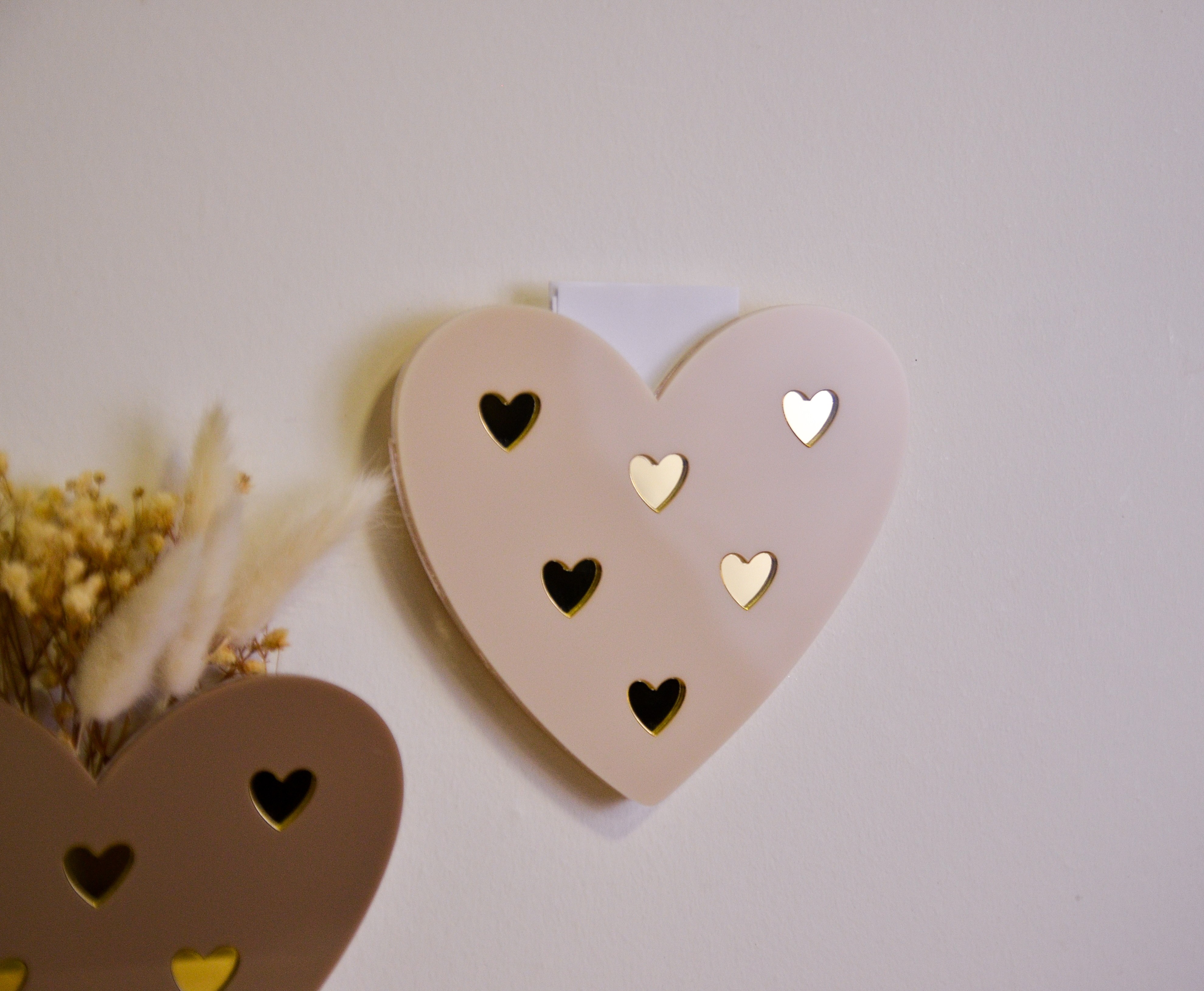 Avec sa forme de cœur et son motif de ribambelle de cœurs colorés sur la face avant, Cœur à secrets est une décoration originale pensée comme un petit bijou mural.