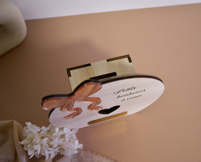 Avec sa forme sobre et son délicat nœud ruban en façade, elle incarne la douceur des projets partagés et l’élégance des petites attentions.