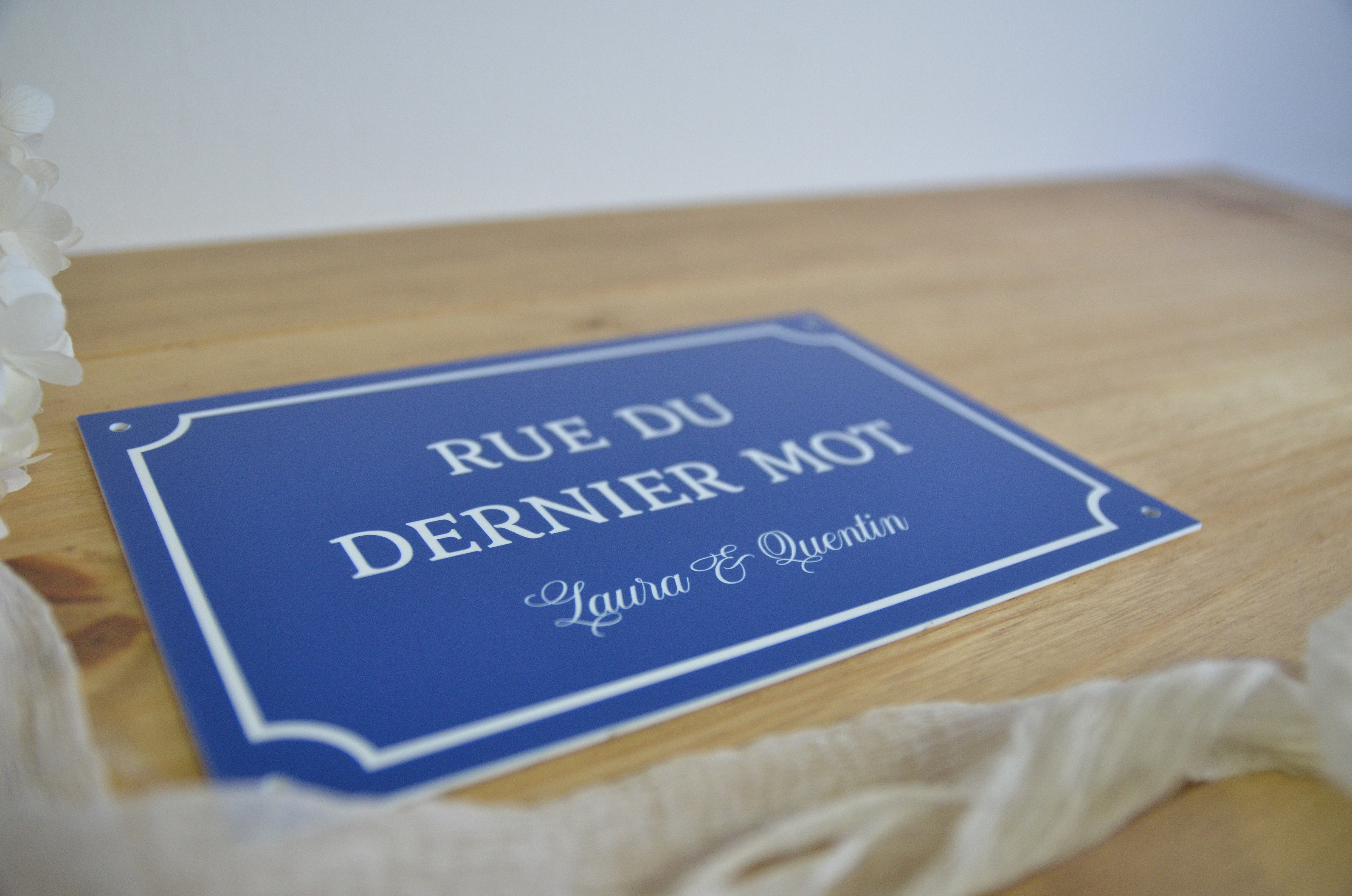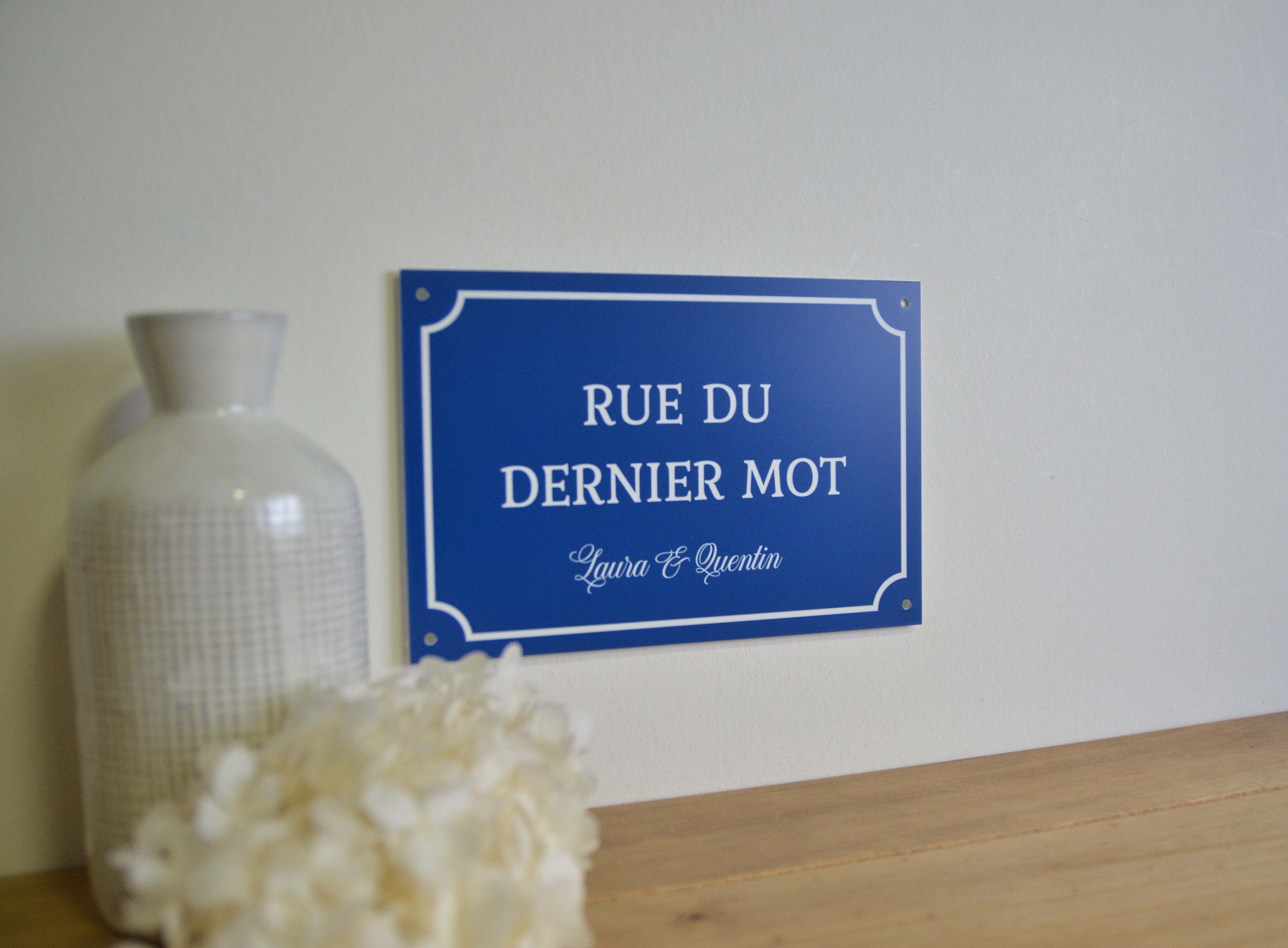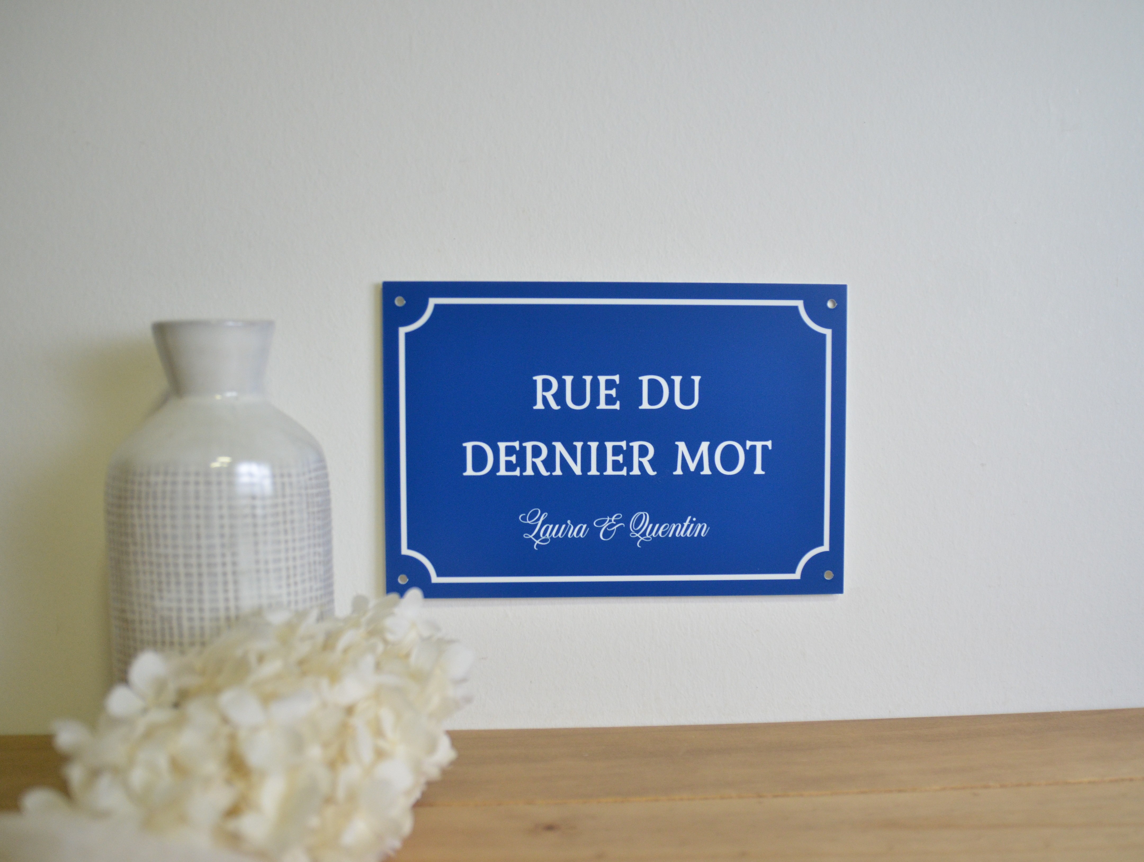 À accrocher dans une chambre, un salon ou une entrée, la plaque Rue du Dernier Mot apporte une touche originale et complice à la décoration.