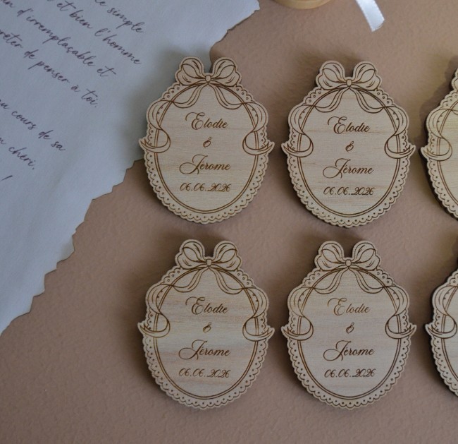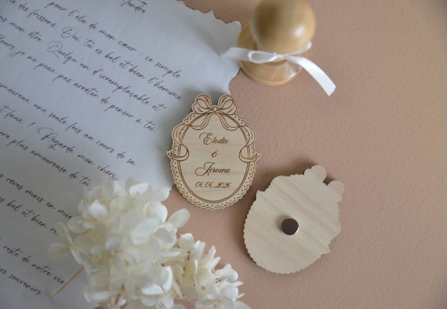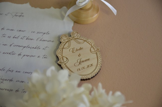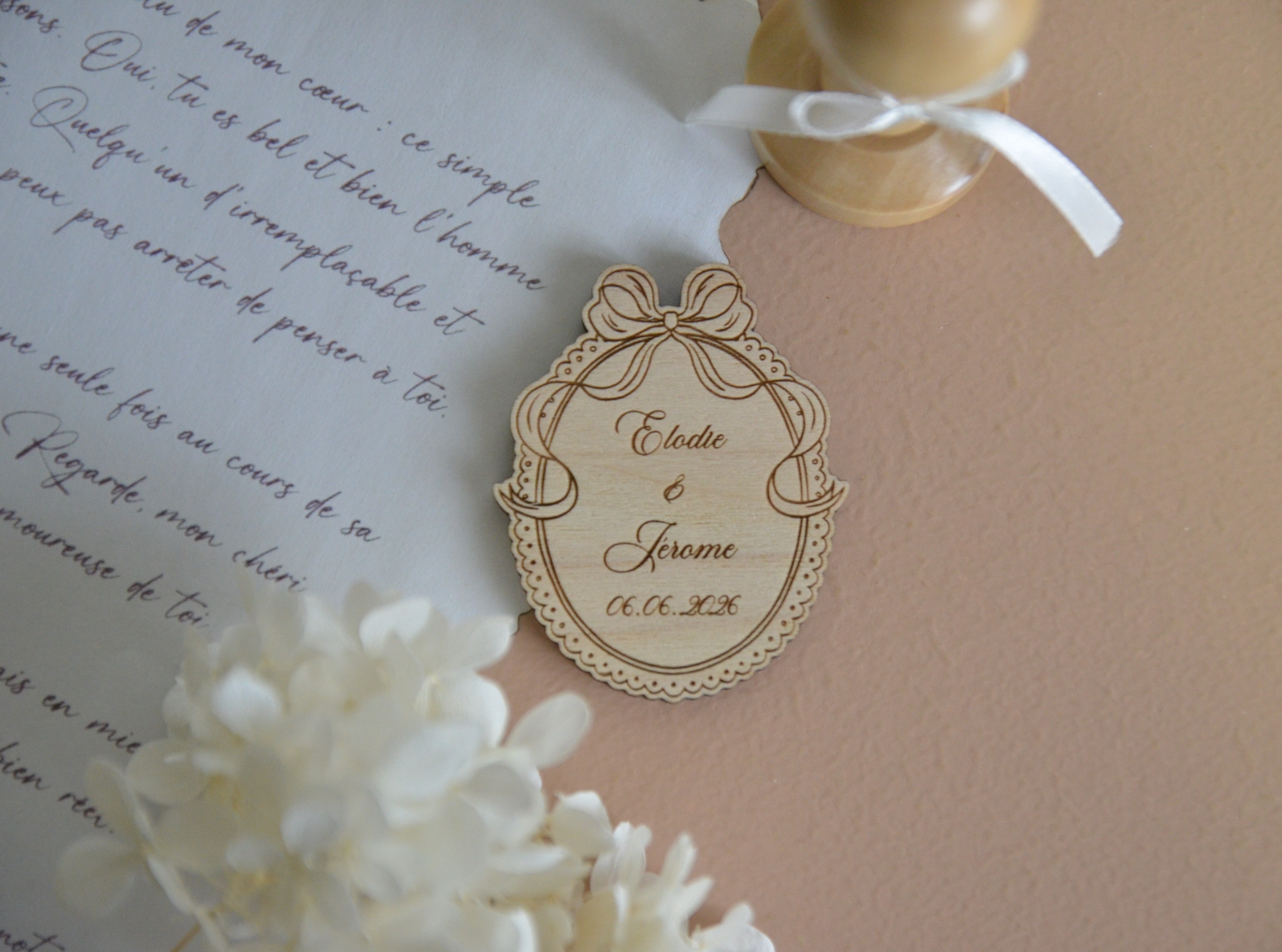 Gravé avec soin dans notre atelier, il devient un véritable souvenir de votre mariage : un objet décoratif que vos proches conserveront longtemps, accroché sur un réfrigérateur ou un support métallique, comme un doux rappel de votre journée.