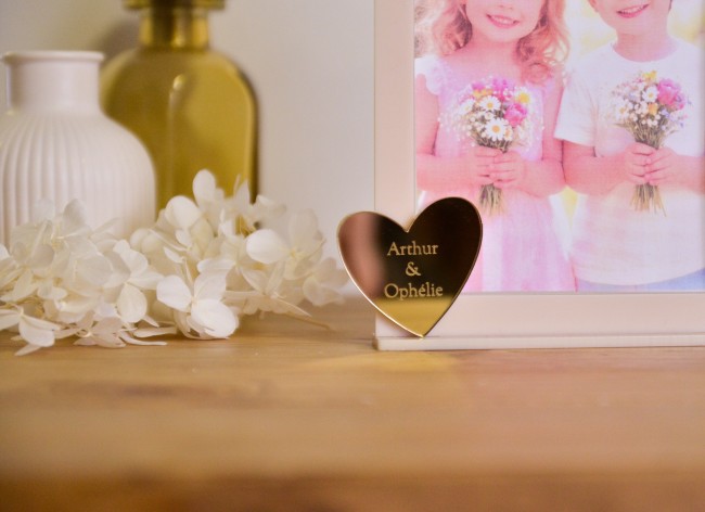 Sur le côté, un cœur délicatement façonné accueille les prénoms des enfants, transformant ce cadre en un objet chargé d’émotion, à la fois décoratif et profondément symbolique.